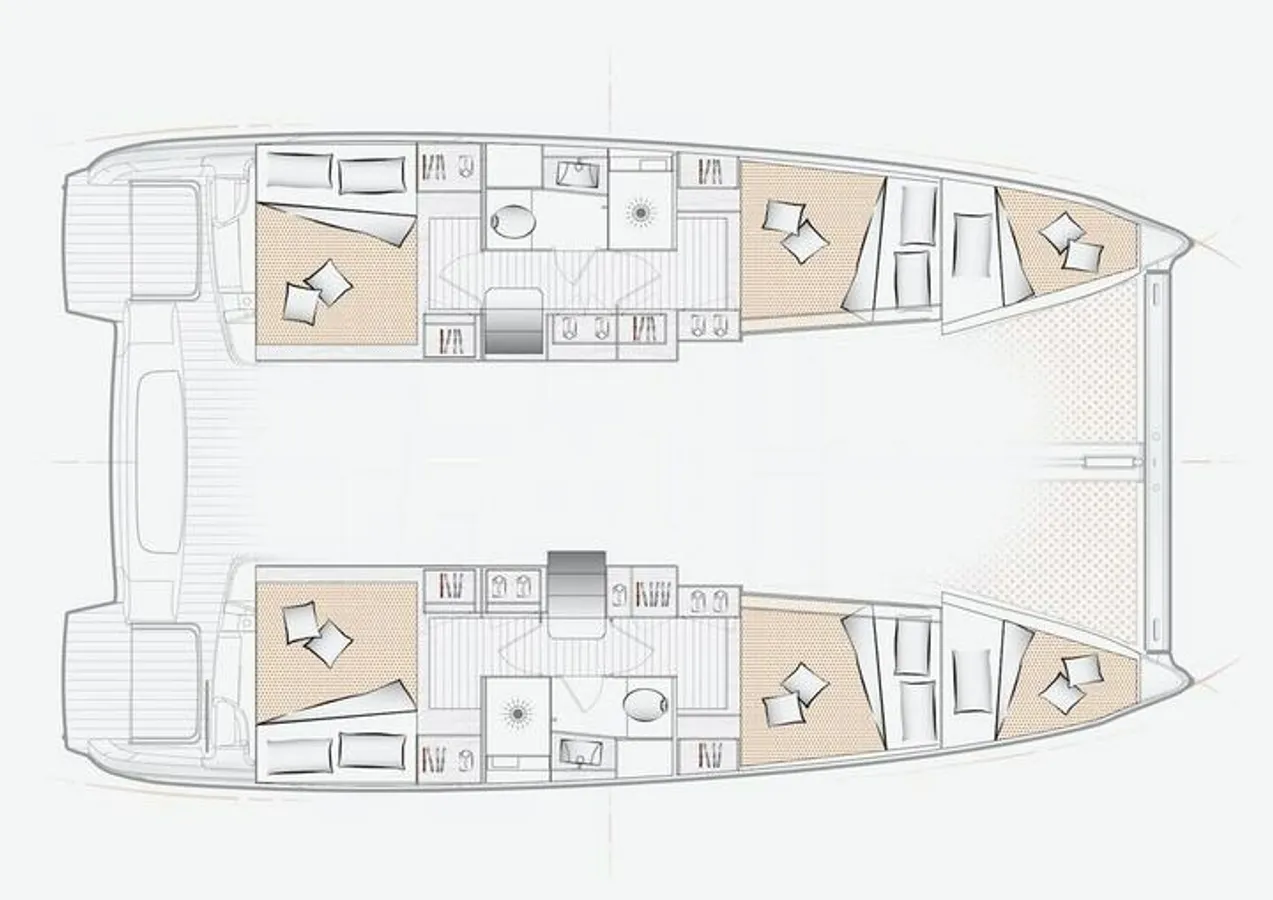 Na katamaranie zazwyczaj znajdują się cztery kabiny dwuosobowe – po jednej dziobowej i rufowej w każdym z pływaków. Każda kabina zapewnia komfortowe warunki dla dwóch osób. Najczęściej posiadają one własne łazienki, choć w niektórych jednostkach jedna łazienka przypada na dwie kabiny. Przydział kabin odbywa się zwykle poprzez losowanie lub w drodze porozumienia między członkami załogi. Cena rejsu podana jest dla jednej osoby w kabinie dwuosobowej.
